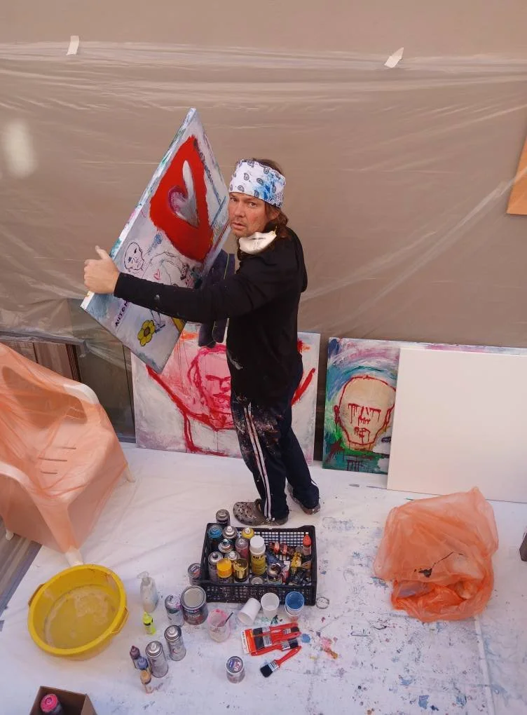 Pigsy’s work is marked by bold, chaotic compositions that reflect personal emotions and inner turmoil. His use of mixed media, including gloss and spray paint, adds texture and depth to his canvases. By incorporating found objects and using tools like broken spray cans, Pigsy adds an unpredictable element to his work. His current exploration of "automatic sorrys" showcases his ability to reflect on personal and societal themes. Pigsy’s journey from architecture to art reveals his desire to break away from the confines of structure, embracing chaos and imperfection.
