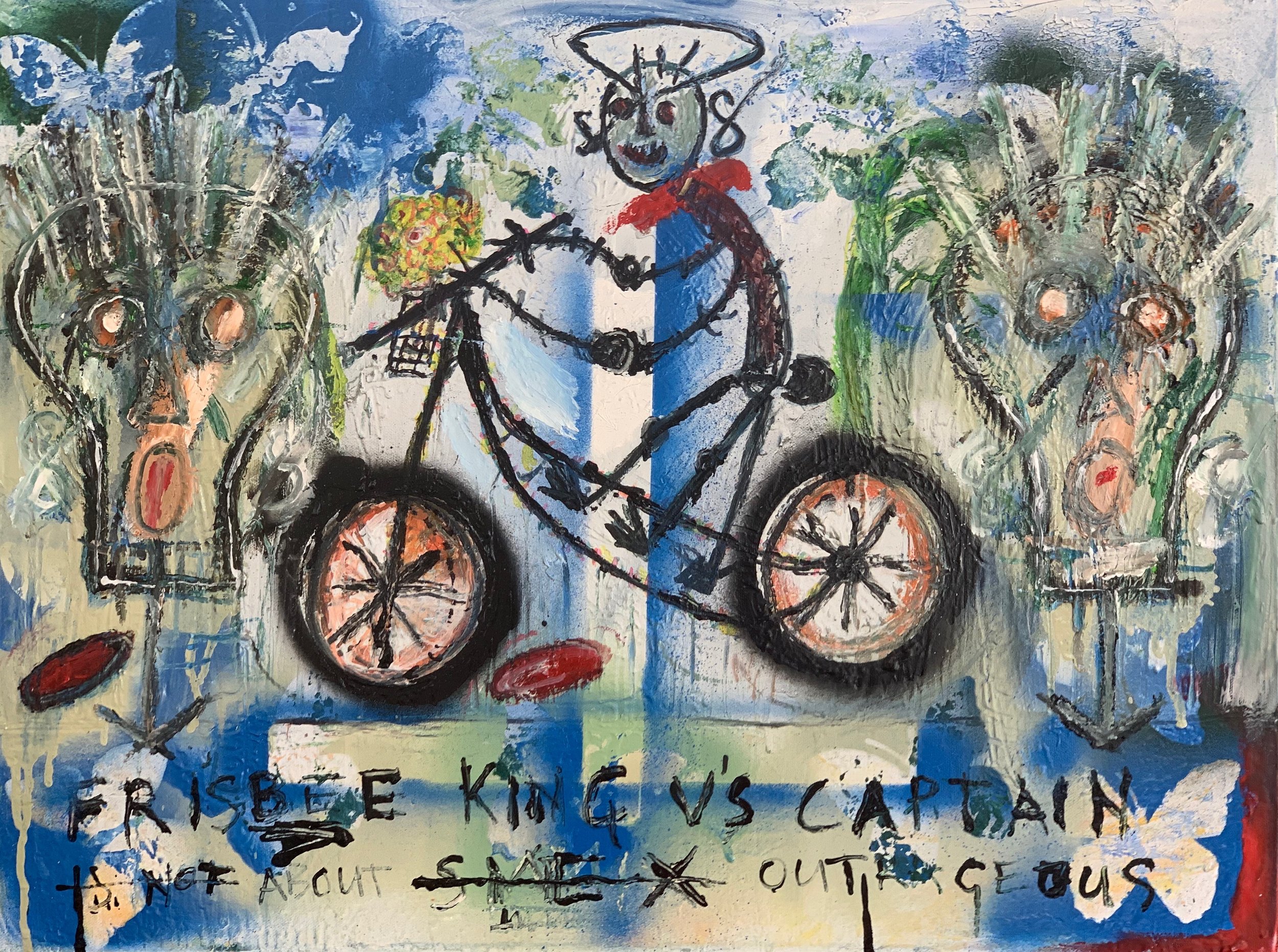 Frisbee King v’s Captain Outrageous - 46 cm H x 61 cm W Mixed Media on Canvas